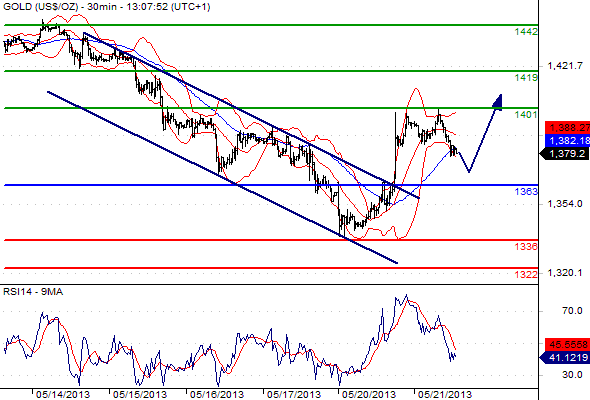 Our preference: LONG positions above 1363 with 1401 & 1419 as next targets.