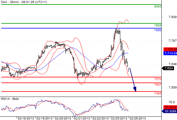 Our preference: SHORT positions below 7860 with 7570 & 7537 as next targets.